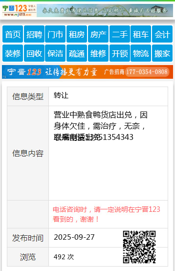 营业中熟食鸭货店出兑,因身体欠佳,需治疗,无奈,忍痛割爱出兑 联系电话13351354343