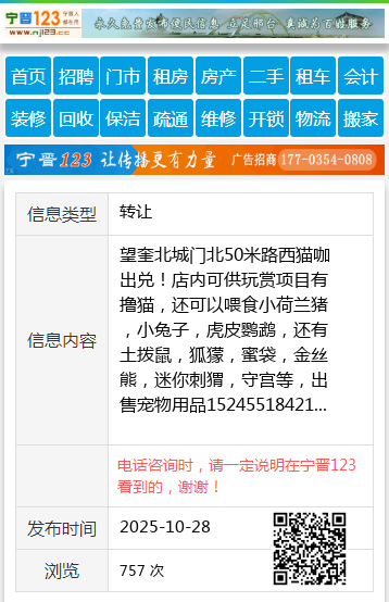 望奎北城门北50米路西猫咖出兑!店内可供玩赏项目有撸猫,还可以喂食小荷兰猪,小兔子,虎皮鹦鹉,还有土拨鼠,狐獴,蜜袋,金丝熊,迷你刺猬,守宫等,出售宠物用品15245518421 【电话咨询时,请一定说明在望奎信息网看到的,谢谢!】 |