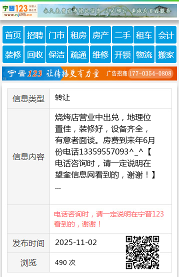 烧烤店营业中出兑,地理位置佳,装修好,设备齐全,有意者面谈。房费到来年6月份电话13359557093^_^