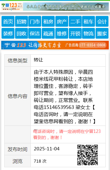 由于本人特殊原因,华晨四楼米线花甲粉转让,本店地理位置佳,客源稳定,转手即可营业,望有缘人接手,转让期间,正常营业。联系电话15146539563 梁女士 【电话咨询时,请一定说明在望奎信息网看到的,谢谢!】 |