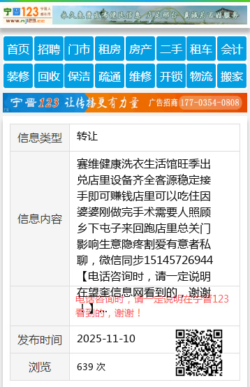 赛维健康洗衣生活馆旺季出兑店里设备齐全客源稳定接手即可赚钱店里可以吃住因婆婆刚做完手术需要人照顾乡下屯子来回跑店里总关门影响生意隐疼割爱有意者私聊,微信同步15145726944 【电话咨询时,请一定说明在望奎信息网看到的,谢谢!】 |
