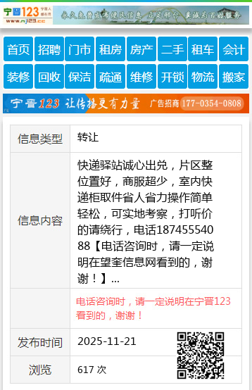 快递驿站诚心出兑,片区整位置好,商服超少,室内快递柜取件省人省力操作简单轻松,可实地考察,打听价的请绕行,电话18745554088 【电话咨询时,请一定说明在望奎信息网看到的,谢谢!】 |