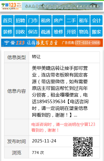 美甲美睫店转让接手即可营业,连店带老板娘有固定客源(带店里微信,如有需要原店主可留店帮忙到过完年分锁客,租金嘎嘎便宜,电话18945539634 【电话咨询时,请一定说明在望奎信息网看到的,谢谢!】 |