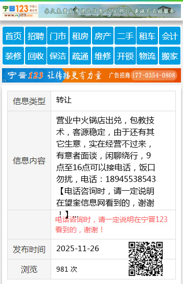营业中火锅店出兑,包教技术,客源稳定,由于还有其它生意,实在经营不过来,有意者面谈,闲聊绕行,9点至16点可以接电话,饭口勿扰,电话:18945538543 【电话咨询时,请一定说明在望奎信息网看到的,谢谢!】 |