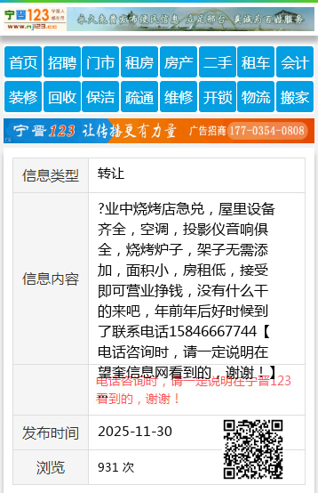 ?业中烧烤店急兑,屋里设备齐全,空调,投影仪音响俱全,烧烤炉子,架子无需添加,面积小,房租低,接受即可营业挣钱,没有什么干的来吧,年前年后好时候到了联系电话15846667744 【电话咨询时,请一定说明在望奎信息网看到的,谢谢!】 |