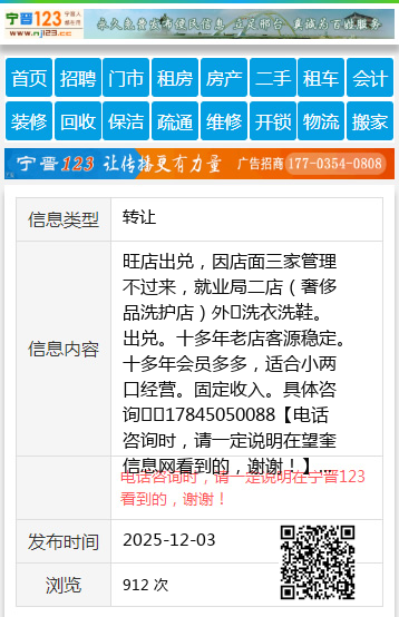 旺店出兑,因店面三家管理不过来,就业局二店(奢侈品洗护店)外➕洗衣洗鞋。出兑。十多年老店客源稳定。十多年会员多多,适合小两口经营。固定收入。具体咨询☎️17845050088 【电话咨询时,请一定说明在望奎信息网看到的,谢谢!】 |