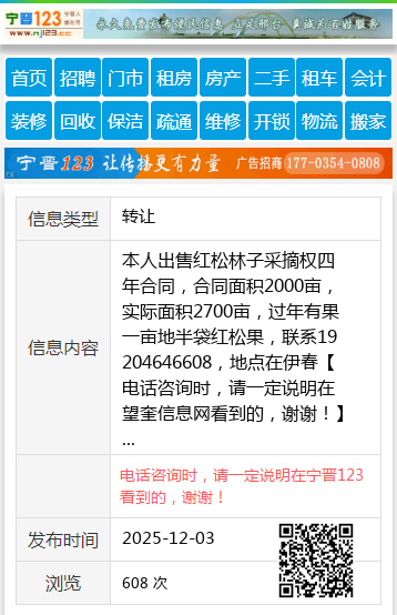 本人出售红松林子采摘权四年合同,合同面积2000亩,实际面积2700亩,过年有果一亩地半袋红松果,联系19204646608,地点在伊春 【电话咨询时,请一定说明在望奎信息网看到的,谢谢!】 |
