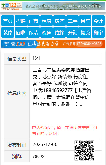 三百北二福满楼商务酒店出兑,地点好 新装修 带房租 客流量好 包赚钱 可签合同 电话:18846592777