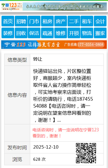 快递驿站出兑,片区整位置好,商服超少,室内快递柜取件省人省力操作简单轻松,可实地考察来店面谈,打听价的请晓行,电话18745554088 【电话咨询时,请一定说明在望奎信息网看到的,谢谢!】 |