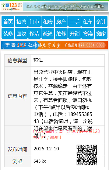 出兑营业中火锅店,现在正是旺季,接手即赚钱,包教技术,客源稳定,由于还有其它生意,实在是经营不过来,有意者面谈,饭口勿扰(下午4点半以后没时间接电话),电话:18945538543 【电话咨询时,请一定说明在望奎信息网看到的,谢谢!】 |