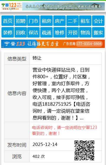 营业中快递驿站出兑,日到件800+,位置好,片区整,好管理,室内灯条取件,方便快捷,两个人就可经营,收入可观,接手即可挣钱,电话18182751925 【电话咨询时,请一定说明在望奎信息网看到的,谢谢!】 |