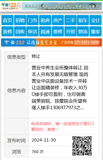 养生会所低价转让:本人另有发展、无暇管理 将营业中店面、设备、技术一并转让,店面精装修,年收入30万➕接手即可盈利,也可做高端美容院、按摩院、会所。联系电话17645519966