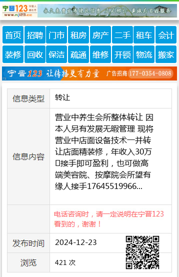 营业中养生会所整体转让 因本人另有发展无暇管理 现将营业中店面设备技术一并转让店面精装修,年收入30万➕接手即可盈利,也可做高端美容院、按摩院会所望有缘人接手17645519966 【电话咨询时,请一定说明在望奎信息网看到的,谢谢!】 |