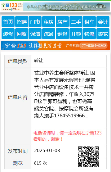 营业中养生会所整体转让 因本人另有发展无暇管理 现将营业中店面设备技术一并转让店面精装修,年收入30万➕接手即可盈利,也可做高端美容院、按摩院会所望有缘人接手17645519966 【电话咨询时,请一定说明在望奎信息网看到的,谢谢!】 |