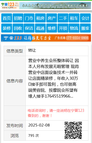 营业中养生会所整体转让 因本人另有发展无暇管理 现将营业中店面设备技术一并转让店面精装修,年收入30万➕接手即可盈利,也可做高端美容院、按摩院会所望有缘人接手17645519966 【电话咨询时,请一定说明在望奎信息网看到的,谢谢!】 |