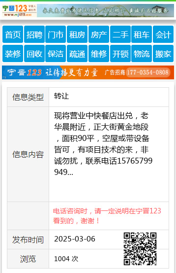现将营业中快餐店出兑,老华晨附近,正大街黄金地段,面积90平,空屋或带设备皆可,有项目技术的来,非诚勿扰,联系电话15765799949 【电话咨询时,请一定说明在望奎信息网看到的,谢谢!】 |