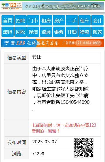由于本人患筋膜炎正在治疗中,店里只有老父亲独立支撑,出兑此店属无奈之举,咱家店生意多好大家都知道,现低价出兑便于安心治病,有意者联系15040544090