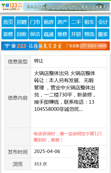 火锅店整体出兑 火锅店整体转让:本人另有发展、无暇管理 ,营业中火锅店整体出兑,一二楼730平,新装修,接手即赚钱,联系电话:13104558000非诚勿扰 【电话咨询时,请一定说明在望奎信息网看到的,谢谢!】 |