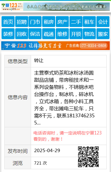 主营泰式奶茶和冰粉冰汤圆甜品店铺,带房租技术和一系列设备物料,不锈钢水吧台操作台,制冰机,碎冰机,立式冰箱,各种小料工具齐全,带出摊电三轮车,只需8千元,联系18137462355 【电话咨询时,请一定说明在望奎信息网看到的,谢谢!】 |