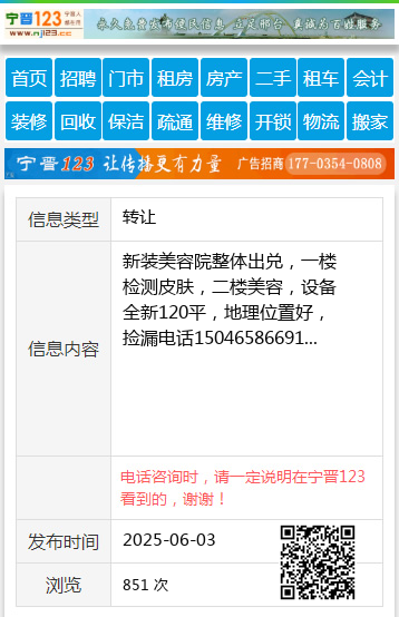 新装美容院整体出兑,一楼检测皮肤,二楼美容,设备全新120平,地理位置好,捡漏电话15046586691