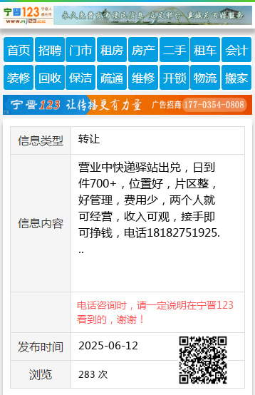 营业中快递驿站出兑,日到件700+,位置好,片区整,好管理,费用少,两个人就可经营,收入可观,接手即可挣钱,电话18182751925 【电话咨询时,请一定说明在望奎信息网看到的,谢谢!】 |