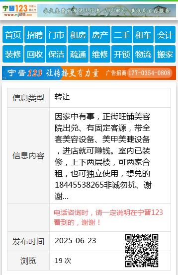 因家中有事,正街旺铺美容院出兑、有固定客源,带全套美容设备、美甲美睫设备,进店就可赚钱。室内已装修,上下两层楼,可两家合租,也可独立使用,想兑的18445538265非诚勿扰、谢谢 【电话咨询时,请一定说明在望奎信息网看到的,谢谢!】 |