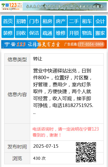 营业中快递驿站出兑,日到件800+,位置好,片区整,好管理,费用少,室内灯条取件,方便快捷,两个人就可经营,收入可观,接手即可挣钱,电话18182751925 【电话咨询时,请一定说明在望奎信息网看到的,谢谢!】 |