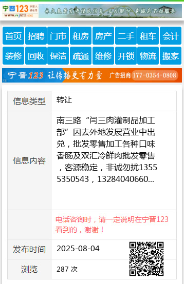 南三路“闫三肉灌制品加工部”因去外地发展营业中出兑,批发零售加工各种口味香肠及双汇冷鲜肉批发零售,客源稳定,非诚勿扰13555350543,13284040660 【电话咨询时,请一定说明在望奎信息网看到的,谢谢!】 |