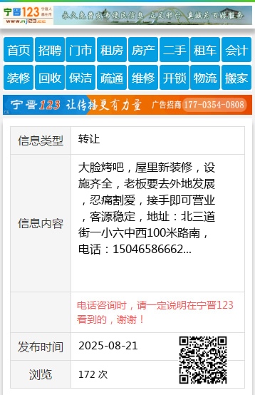 大脸烤吧,屋里新装修,设施齐全,老板要去外地发展,忍痛割爱,接手即可营业,客源稳定,地址:北三道街一小六中西100米路南,电话:15046586662 【电话咨询时,请一定说明在望奎信息网看到的,谢谢!】 |