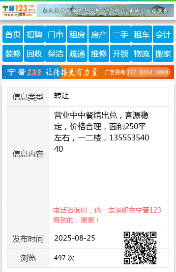 营业中中餐馆出兑,客源稳定,价格合理,面积250平左右,一二楼,13555354040