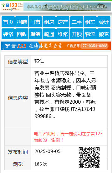 营业中鸭货店整体出兑、三年老店 客源稳定,因本人另有发展 忍痛割爱,口味新颖独特 回头客无数,带设备 带技术,有稳定2000+客源,接手即可赚钱 电话17649999886 【电话咨询时,请一定说明在望奎信息网看到的,谢谢!】 |