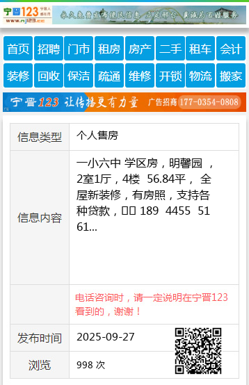 一小六中 学区房,明馨园 ,2室1厅,4楼 56.84平, 全屋新装修,有房照,支持各种贷款,☎️ 189 4455 5161 【电话咨询时,请一定说明在望奎信息网看到的,谢谢!】 |