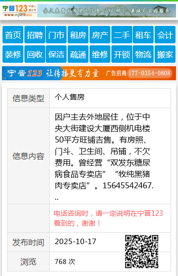 因户主去外地居住,位于中央大街建设大厦西侧机电楼50平方旺铺吉售。有房照、门斗、卫生间、吊铺,不欠费用。曾经营“双发东糖尿病食品专卖店”“牧纯黑猪肉专卖店”。15645542467 【电话咨询时,请一定说明在望奎信息网看到的,谢谢!】 |