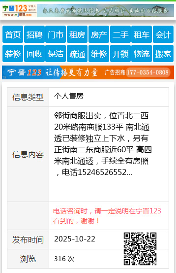 邻街商服出卖,位置北二西20米路南商服133平 南北通透已装修独立上下水,另有正街南二东商服近60平 高四米南北通透,手续全有房照,电话15246526552 【电话咨询时,请一定说明在望奎信息网看到的,谢谢!】 |