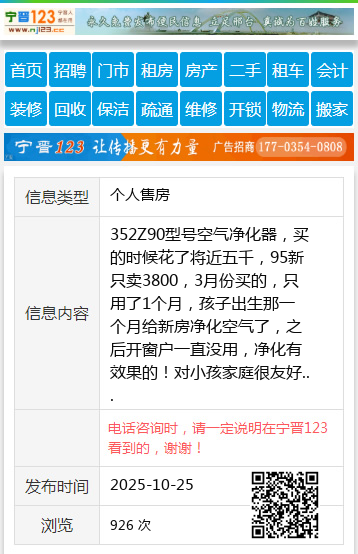 352Z90型号空气净化器,买的时候花了将近五千,95新只卖3800,3月份买的,只用了1个月,孩子出生那一个月给新房净化空气了,之后开窗户一直没用,净化有效果的!对小孩家庭很友好 【电话咨询时,请一定说明在望奎信息网看到的,谢谢!】 |
