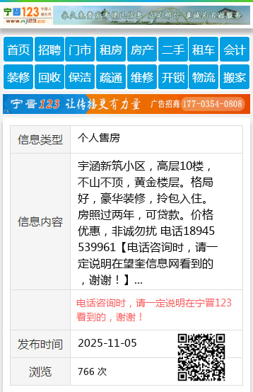 宇涵新筑小区,高层10楼,不山不顶,黄金楼层。格局好,豪华装修,拎包入住。房照过两年,可贷款。价格优惠,非诚勿扰 电话18945539961 【电话咨询时,请一定说明在望奎信息网看到的,谢谢!】 |