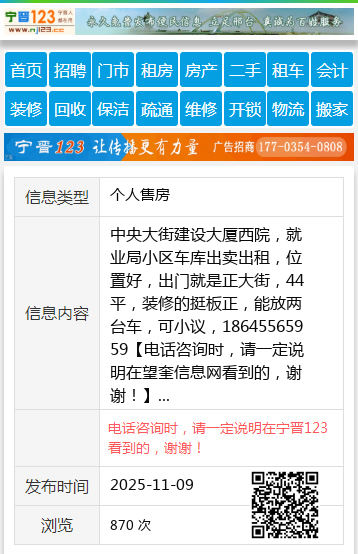 中央大街建设大厦西院,就业局小区车库出卖出租,位置好,出门就是正大街,44平,装修的挺板正,能放两台车,可小议,18645565959 【电话咨询时,请一定说明在望奎信息网看到的,谢谢!】 |