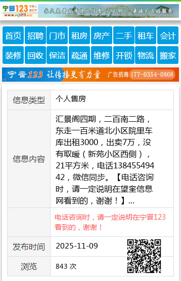 汇景阁四期,二百南二路,东走一百米道北小区院里车库出租3000,出卖7万,没有取暖(新苑小区西侧),21平方米,电话13845549442,微信同步。 【电话咨询时,请一定说明在望奎信息网看到的,谢谢!】 |