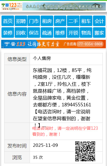 东福花园,12楼,85平,纯纯婚房,没住几次,嘎嘎新,2室1厅,拎包入住,楼下就是林峰广场,高档装修,全屋品牌家电,黄金位置,去哪都方便,18944555161 【电话咨询时,请一定说明在望奎信息网看到的,谢谢!】 |