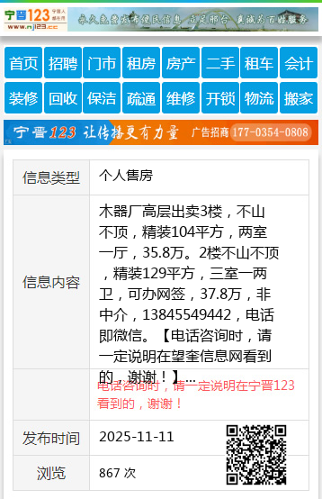 木器厂高层出卖3楼,不山不顶,精装104平方,两室一厅,35.8万。2楼不山不顶,精装129平方,三室一两卫,可办网签,37.8万,非中介,13845549442,电话即微信。 【电话咨询时,请一定说明在望奎信息网看到的,谢谢!】 |