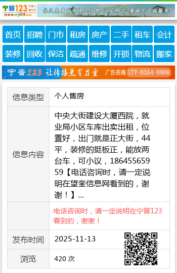 中央大街建设大厦西院,就业局小区车库出卖出租,位置好,出门就是正大街,44平,装修的挺板正,能放两台车,可小议,18645565959 【电话咨询时,请一定说明在望奎信息网看到的,谢谢!】 |