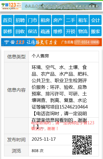 环境、空气、水、土壤、食品、农产品、水产品、肥料、公共卫生、职业卫生检测评价服务;环评、验收、应急预案、排污许可、可研、土壤调查、剥离、复垦、水论证等编写项目15246210464 【电话咨询时,请一定说明在望奎信息网看到的,谢谢!】 |
