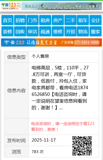 电梯高层,5楼,110平,27.8万可讲,两室一厅,可贷款,低首付,拎包入住,家电家具都带,看房电话18746526850 【电话咨询时,请一定说明在望奎信息网看到的,谢谢!】 |