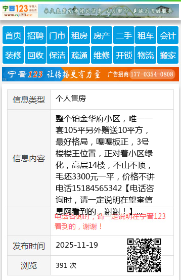 整个铂金华府小区,唯一一套105平另外赠送10平方,最好格局,嘎嘎板正,3号楼楼王位置,正对着小区绿化,高层14楼,不山不顶,毛坯3300元一平,价格不讲电话15184565342 【电话咨询时,请一定说明在望奎信息网看到的,谢谢!】 |