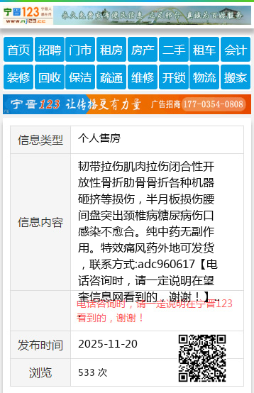 韧带拉伤肌肉拉伤闭合性开放性骨折肋骨骨折各种机器砸挤等损伤,半月板损伤腰间盘突出颈椎病糖尿病伤口感染不愈合。纯中药无副作用。特效痛风药外地可发货,联系方式:adc960617 【电话咨询时,请一定说明在望奎信息网看到的,谢谢!】 |
