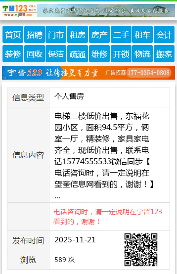 电梯三楼低价出售,东福花园小区,面积94.5平方,俩室一厅,精装修,家具家电齐全,现低价出售,联系电话15774555533微信同步 【电话咨询时,请一定说明在望奎信息网看到的,谢谢!】 |