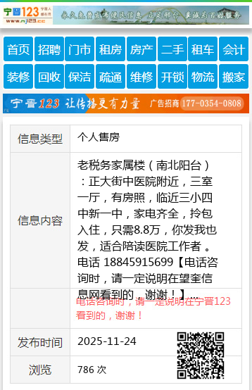 老税务家属楼(南北阳台):正大街中医院附近,三室一厅,有房照,临近三小四中新一中,家电齐全,拎包入住,只需8.8万,你发我也发,适合陪读医院工作者 。电话 18845915699 【电话咨询时,请一定说明在望奎信息网看到的,谢谢!】 |