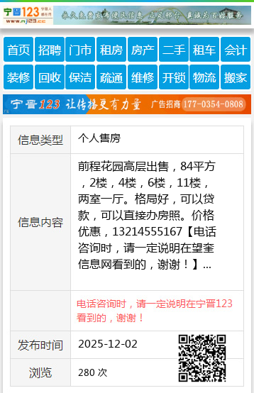 前程花园高层出售,84平方,2楼,4楼,6楼,11楼,两室一厅。格局好,可以贷款,可以直接办房照。价格优惠,13214555167 【电话咨询时,请一定说明在望奎信息网看到的,谢谢!】 |