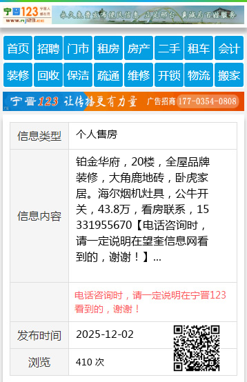 铂金华府,20楼,全屋品牌装修,大角鹿地砖,卧虎家居。海尔烟机灶具,公牛开关,43.8万,看房联系,15331955670 【电话咨询时,请一定说明在望奎信息网看到的,谢谢!】 |