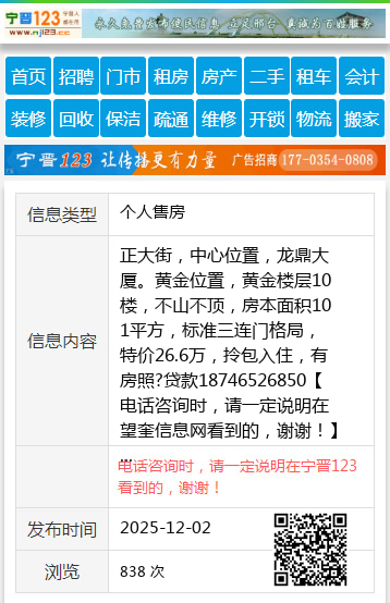 正大街,中心位置,龙鼎大厦。黄金位置,黄金楼层10楼,不山不顶,房本面积101平方,标准三连门格局,特价26.6万,拎包入住,有房照?贷款18746526850 【电话咨询时,请一定说明在望奎信息网看到的,谢谢!】 |
